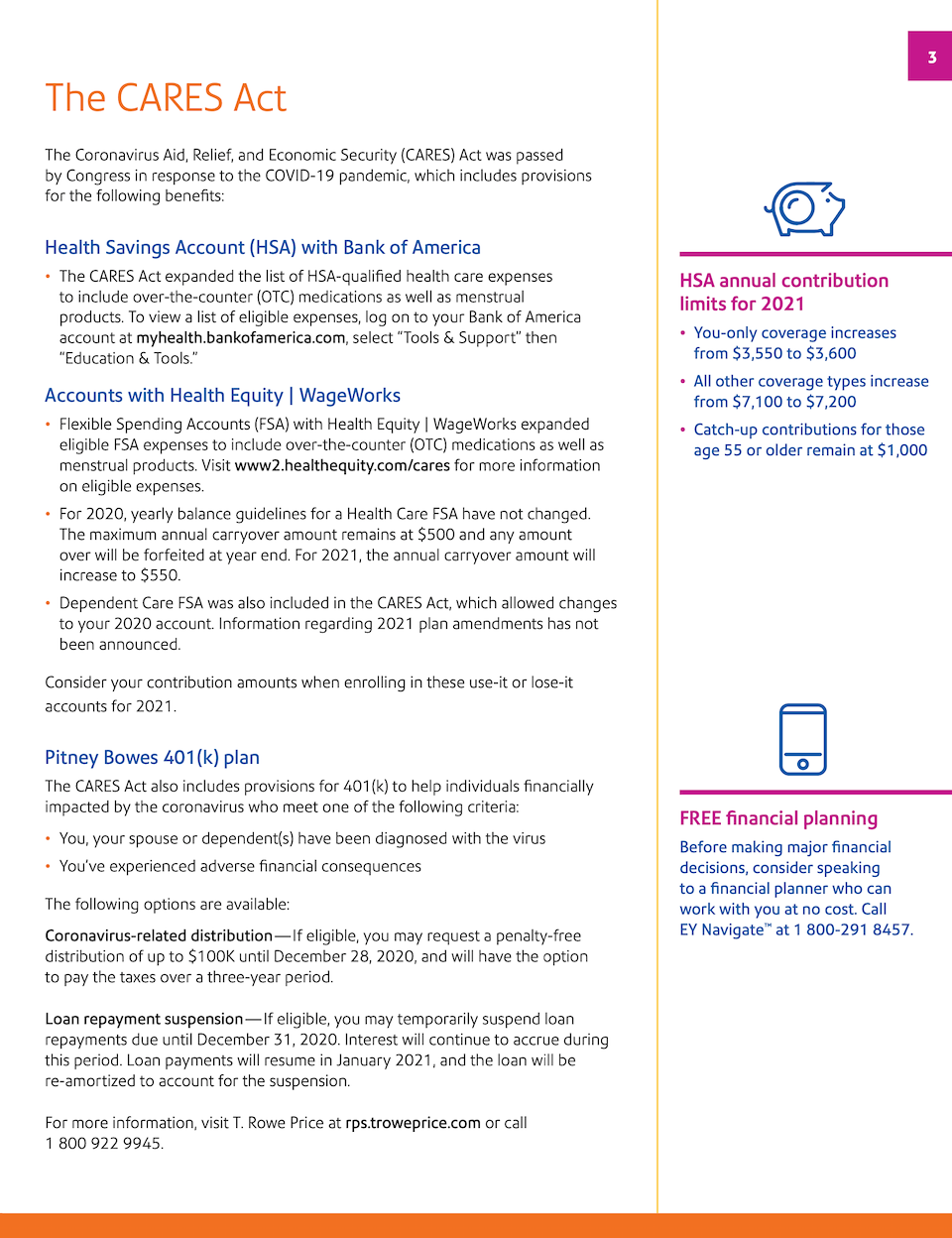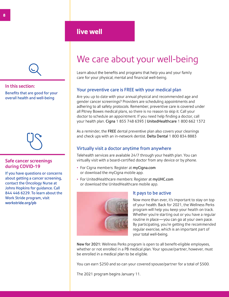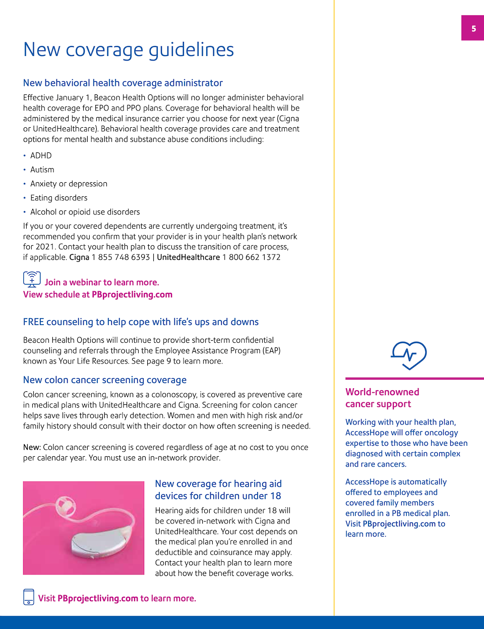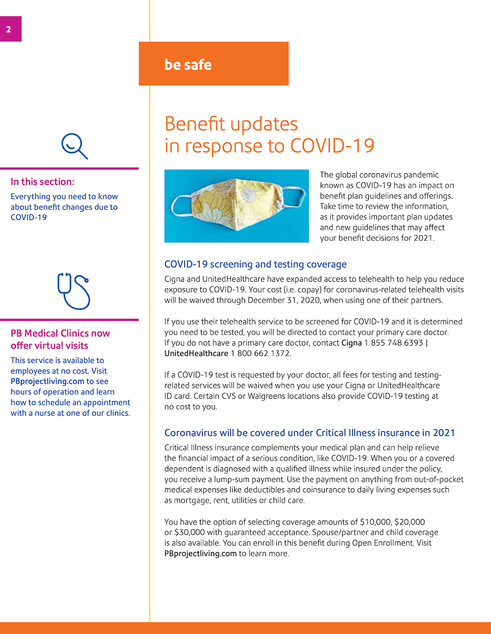 Creating enrollment materials for 2021 presented a new challenge: Address the immediate needs as a result of COVID-19 while presenting the important updates and changes for the coming year. The cheerful layout combined with the conversational tone was designed to bring positivity to the subject of health care.